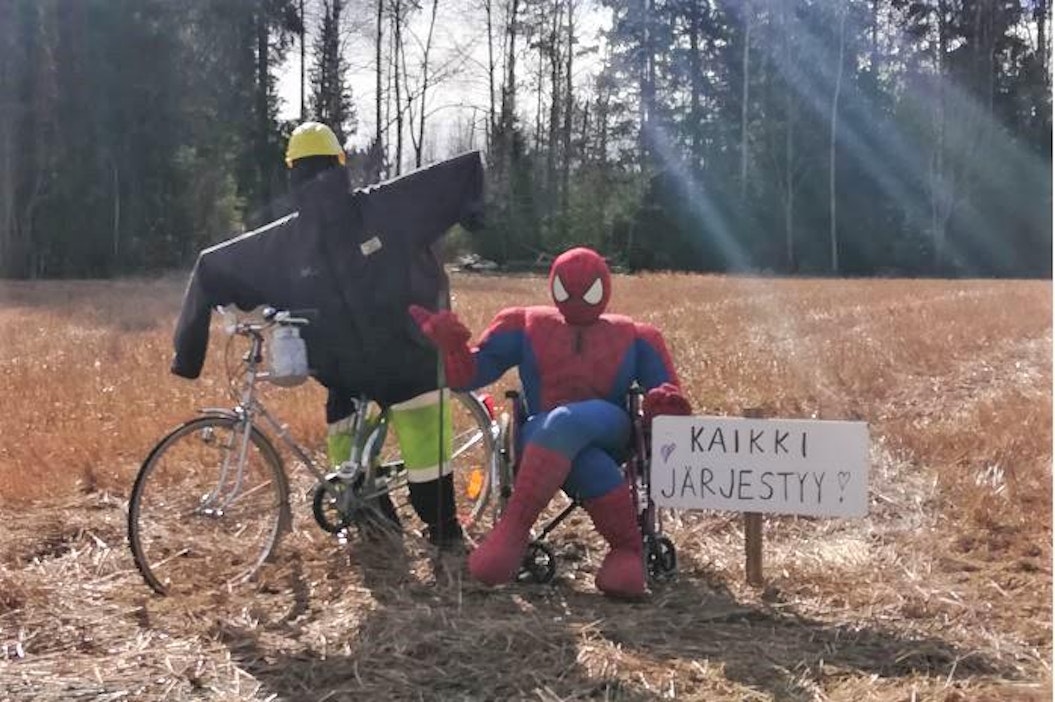 Suvi Isosävi Sastamalan Suodenniemeltä lähetti kuvan pellonlaidalla patsastelevista kaveruksista. Pyöräilevä järjestyksenvalvoja on seurannut kyläläisten touhuja jo jonkin aikaa, mutta poikkeusaikana tarvitaan ehdottomasti aivan uudenlaista turvallisuudentunnetta. Niinpä tukijoukoksi saapui itse Spiderman, joka vakuuttaa, että kaikki järjestyy.