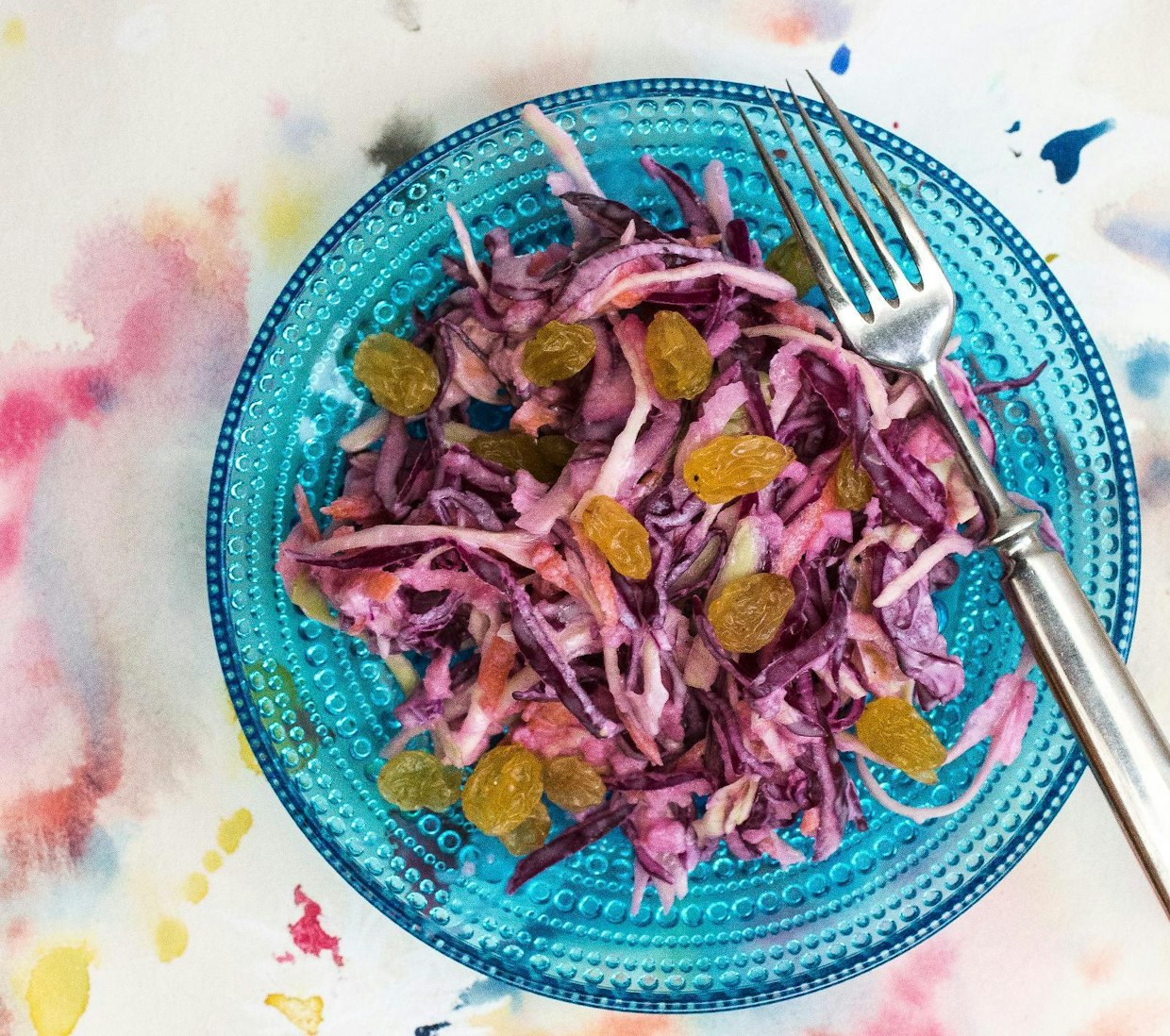 Sekoita kastikkeen ainekset ja kääntele seos kaaliseokseen. Lisää lopuksi rusinat salaatin päälle.