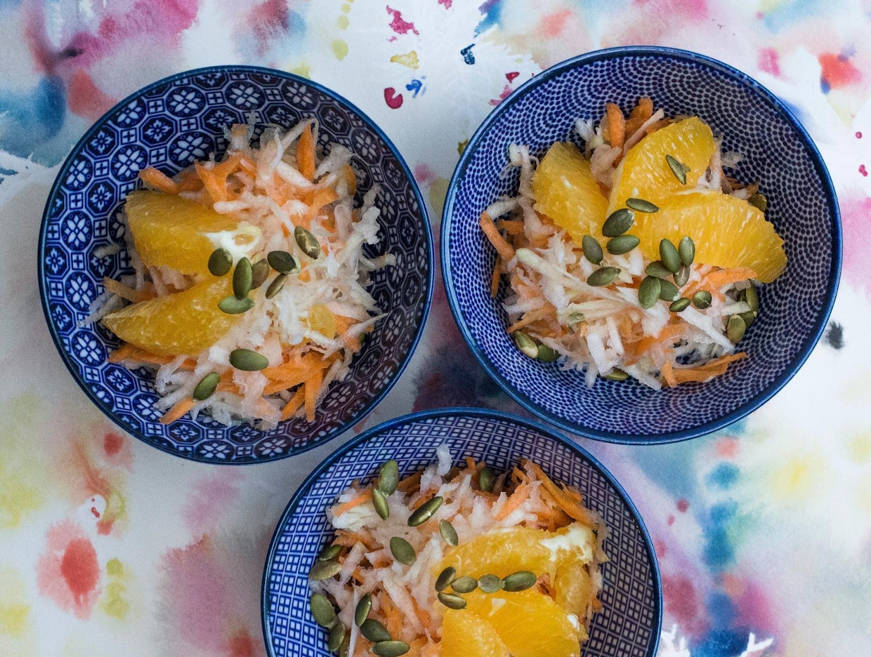 Kuori ja raasta porkkanat ja kyssäkaali. Sekoita raasteet. Kuori appelsiini ja leikkaa lohkot irti kalvoista. Lisää appelsiinilohkot raasteen päälle. Paahda kurpitsansiemenet kuivalla pannulla ja ripottele pinnalle.