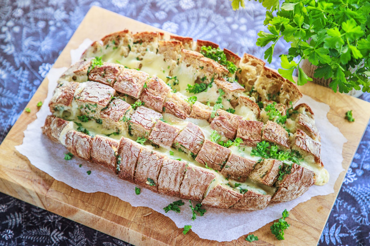 Lämpimästä nyhtöleivästä riittää useammallekin herkuttelijalle. Tarvitset vain kokonaisen leivän, viiltoihin maustevoita ja raclettejuustoa sekä vartin verran uunin lämpöä. Kuva: Sanne KatainenJuustoinen nyhtöleipä