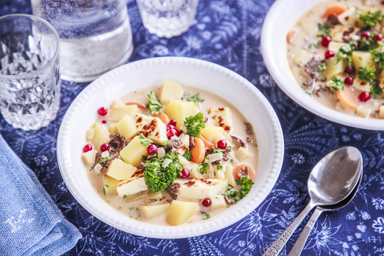 - Jaa keitto lautasille ja lisää päälle leipäjuustopaloja ja puolukoita.