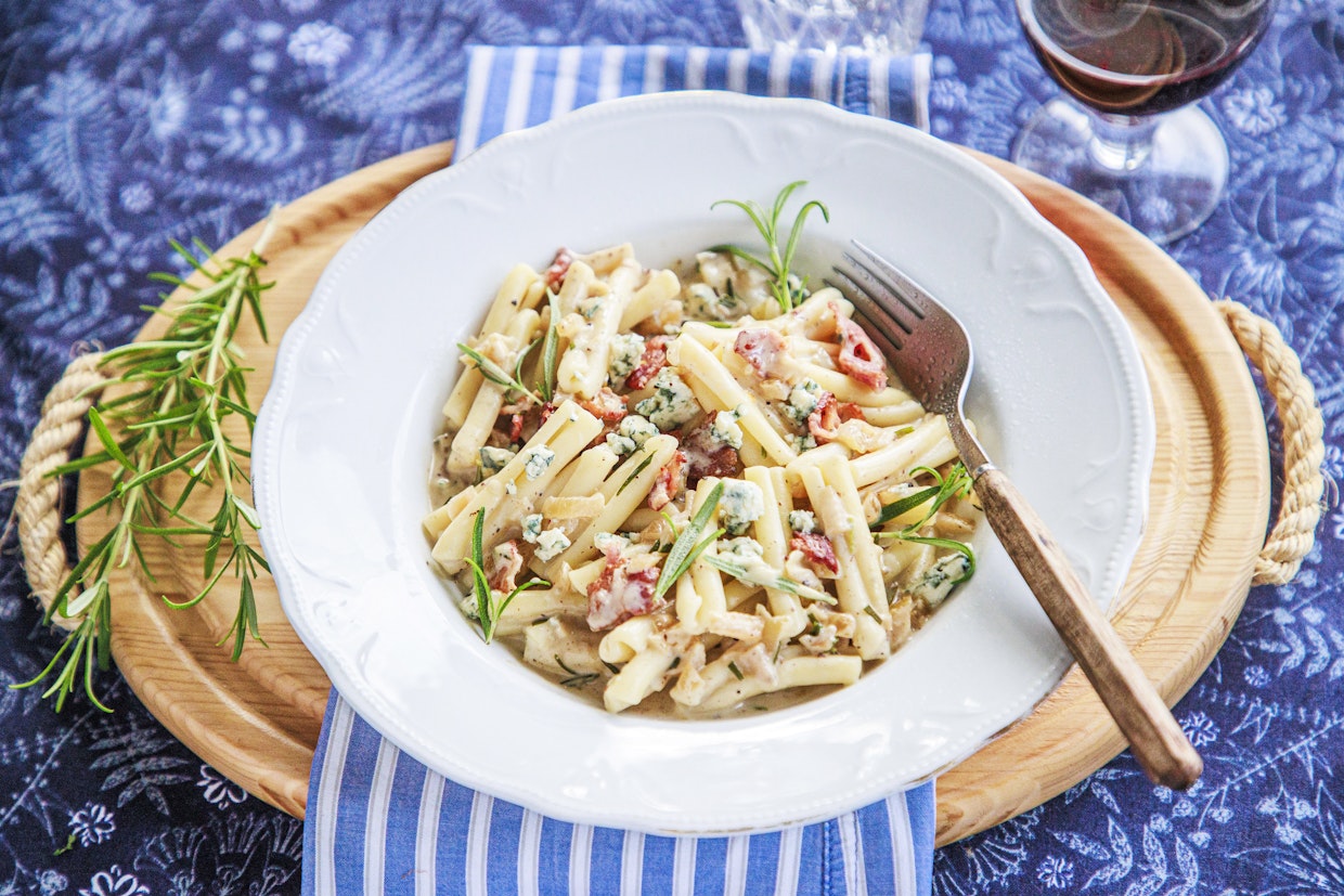 Kun sinihomejuusto kohtaa kerman, on lautasella tuota pikaa täyteläistä pastakastiketta. Sattumiksi sopivat rapeat pekonimurut ja makeaksi haudutettu sipuli. Kuva: Sanne KatainenSinihomejuusto-pekonipasta