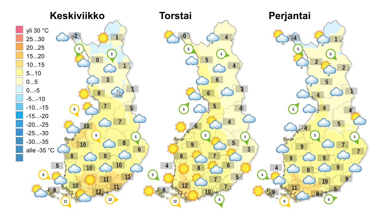 Pohjoisesta virtaa keskiviikosta alkaen koko maahan kylmää ilmaa. Keskiviikosta on tulossa hyvin tuulinen ja paikalliset tuulituhotkin ovat mahdollisia.