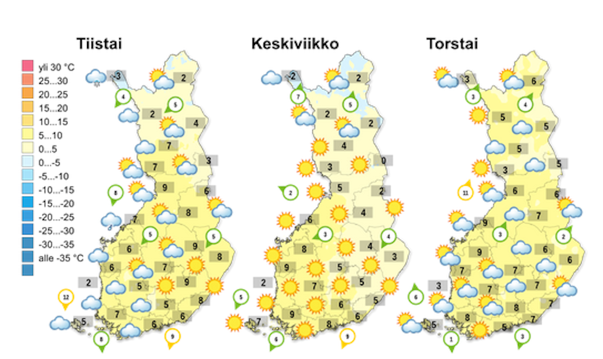 Tiistain aikana matalapaine vetäytyy itään ja sää poutaantuu koko maassa. Keskiviikosta alkaen sää lämpenee ja on laajalti aurinkoista.Väistyvä matalapaine kasteli maastoa koko maan mitalta pääsiäisen aikaan ja sää oli laajalti pilvisen harmaa. Toisaalta sademäärät jäivät suhteellisen maltilliseksi, mikä tarkoittaa että maaston kuivuminen pääsee keskiviikosta alkaen vauhtiin aurinkoisessa poutasäässä.