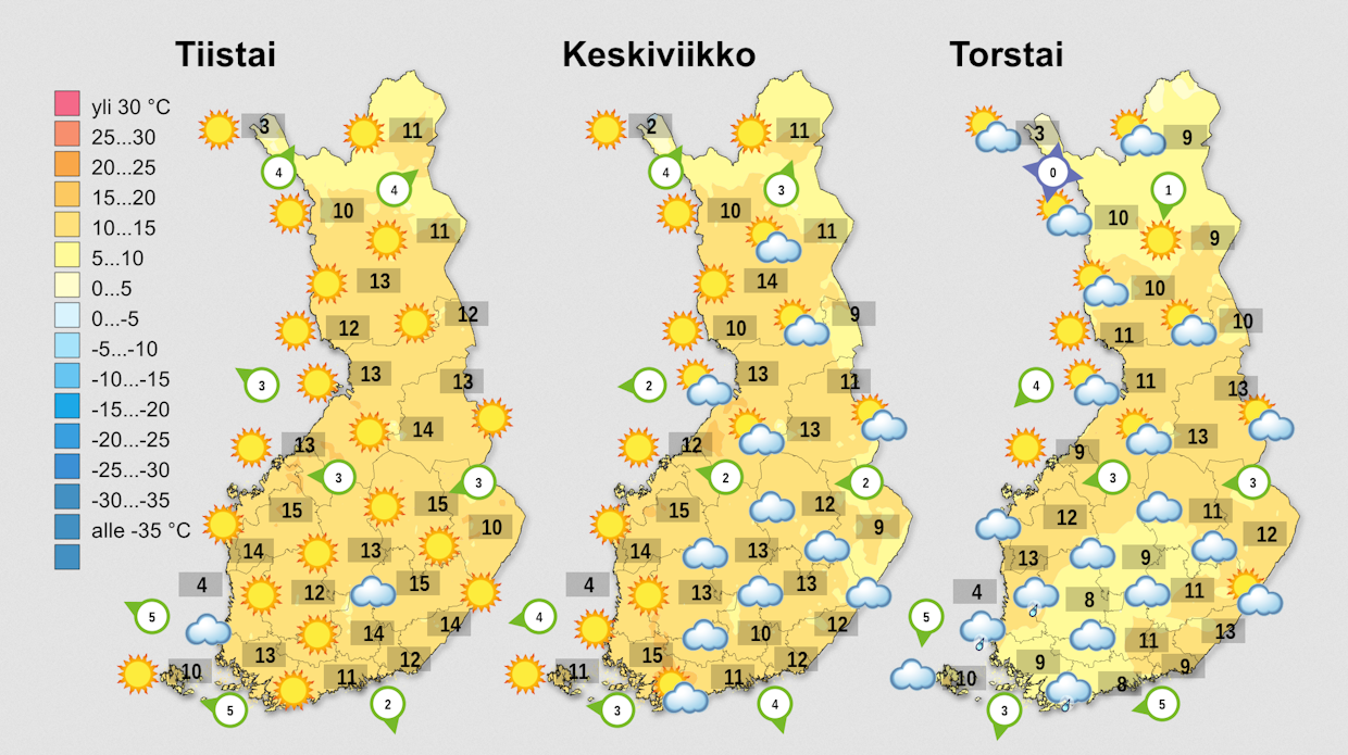 Suomen yllä oleva korkeapaine pitää edelleen pintansa ja pitää sateet poissa. Viikon edetessä sateen todennäköisyys kasvaa korkeapaineen antaessa periksi.Viime päivinä lämpötila on noussut paikoin yli viidentoista asteen, joka vastaa ennemminkin tyypillistä toukokuun puolenvälin päivälämpötilaa. Maanantaina iltapäivällä lämpötila nousi Kuhmossa 16,5 asteeseen, joka on toistaiseksi kevään korkein mitattu lukema.