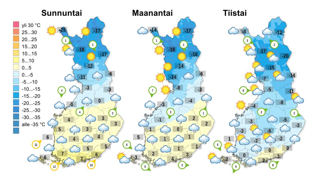Lauhan viikonvaihteen jälkeen alkuviikolla sää pakastuu vähitellen etelässäkin. Loppuviikolla sää kuitenkin lauhtuu jälleen, kun laaja matalapaine saapuu lännestä. Lauha säätyyppi voi pysyä vallitsevana pidempään.Tänään sunnuntaina maan etelä- ja keskiosassa on plusasteita ja ajoittain sataa vettä tai tihkua. Pohjoisessa on sen sijaan talvista ja Lapissa pakkanen edelleen kireää. Lämpötilaero etelän ja Lapin välillä voi olla tänään jopa yli 30 astetta.