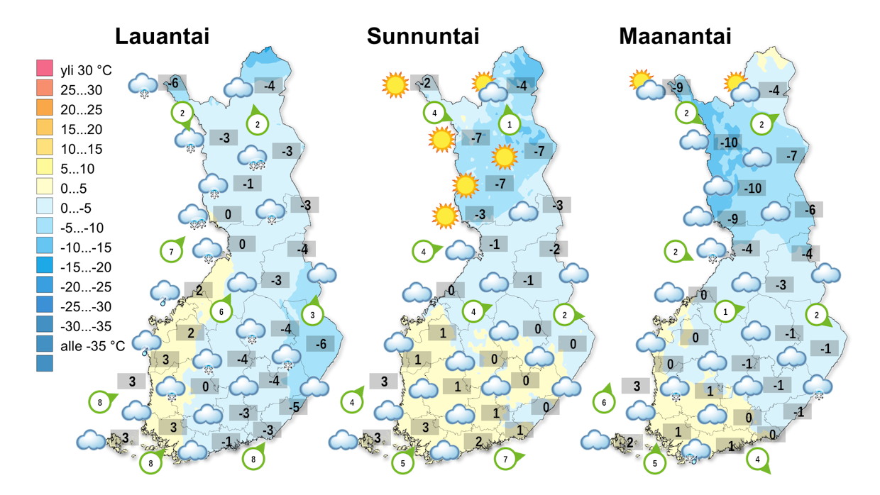 Illalla pilvipeite rakoilee Pohjanmaan suunnalla, sunnuntaiyönä myös Länsi- ja Pohjois-Lapissa. Sunnuntaiyöhön tai -aamuun mennessä sää poutaantuu koko maassa, mutta sumua saattaa muodostua. Lauantain lämpötilat ovat +4 ja -8 asteen välillä, lauhinta on länsirannikolla.
