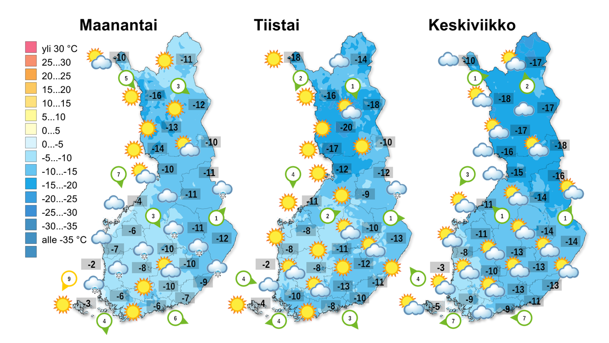Alkavalla viikolla säähän vaikuttaa korkeapaine. Aluksi pakkanen on kireää etenkin pohjoisessa, mutta kiristyy loppuviikolla myös etelässä.Tänään maanantaina maan keskivaiheilla sataa ajoittain lunta ja pöllyävä lumi heikentää ajokeliä. Muutoin lumisateet jäävät vähäisiksi koko viikon aikana, lähinnä pilvisellä säällä voi edelleen tulla heikkoja pakkaslumisateita.