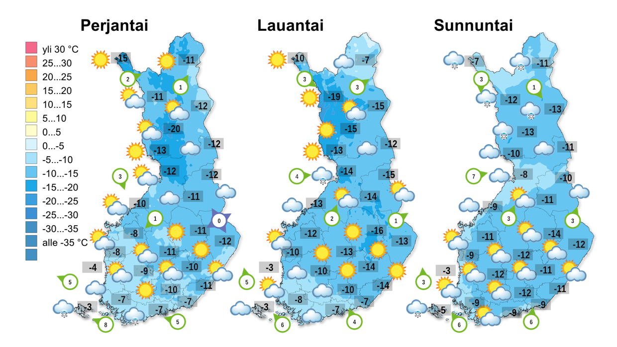 Lauantai on pilvisyydeltään vaihteleva ja enimmäkseen poutainen päivä. Pakkasta on yleisesti kaksinumeroinen luku, pohjoisessa jopa kakkosella alkava luku.