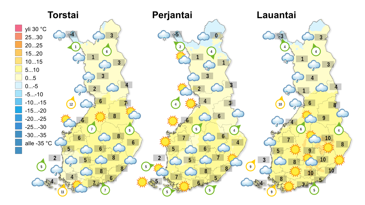 Torstaina päivän ylin lämpötila on neljän ja kymmenen asteen välillä, Lapissa yhden pakkasasteen ja viiden plusasteen välillä.