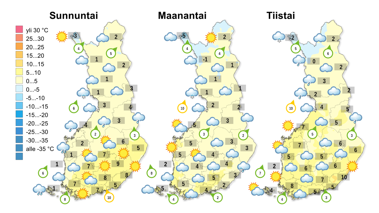 Yön alin lämpötila on -1 ja +7, Lapissa +2 ja -3 asteen välillä, sunnuntaipäivän ylin lämpötila +3 ja +10, Lapissa -2 ja +3 astetta.