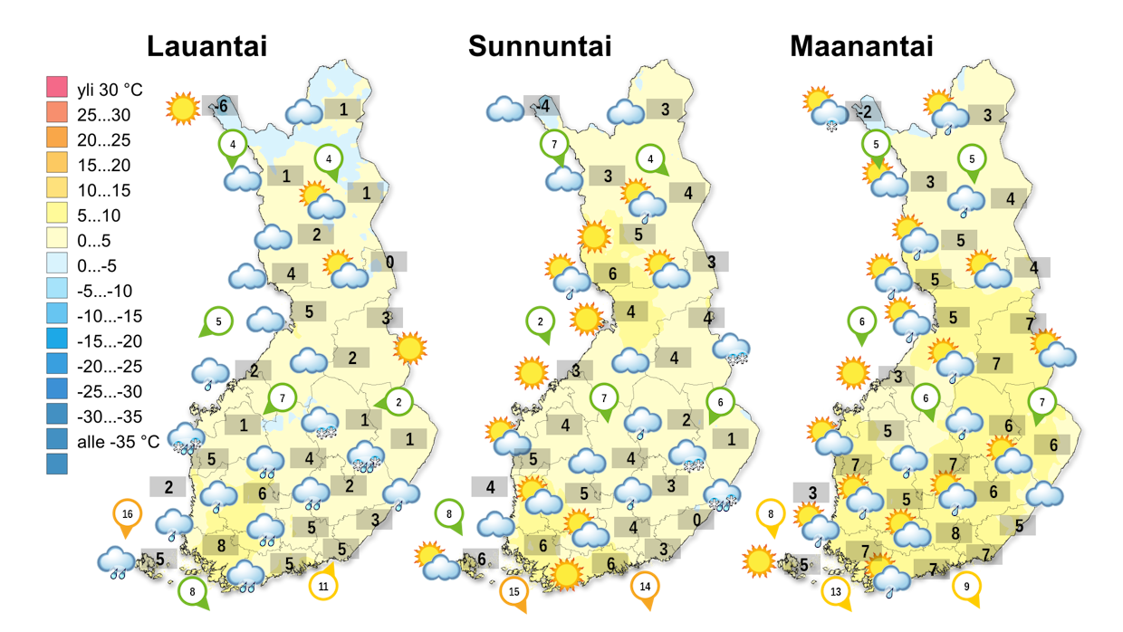 Pohjoisessa sää on viikonloppuna muuta maata rauhallisempi. Ajoittain tulee yksittäisiä lumi- ja räntäkuuroja ja pilvisyys vaihtelee puolipilvisen molemmin puolin. Maanantaina lumi- ja räntäkuuroja tulee koko maassa. Sää viilenee ja lämpötila on lähipäivinä koko maassa päivisin 0...+10, öisin taas -10...+2 astetta.
