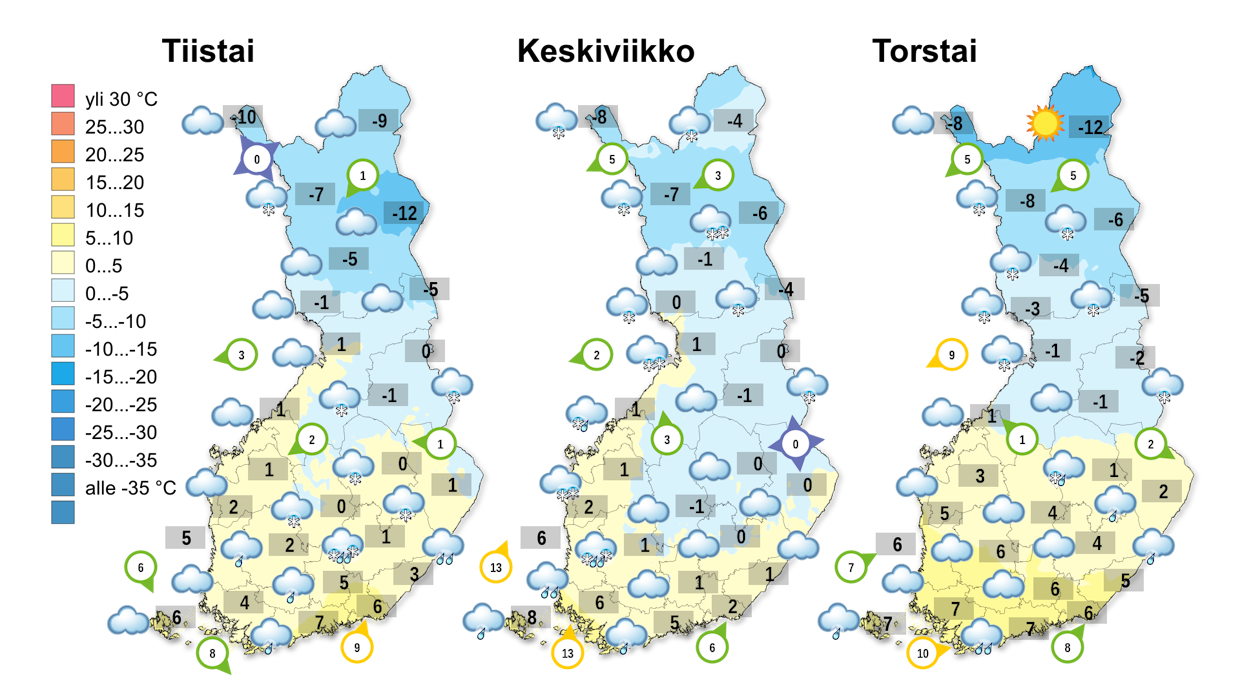 Torstaina Pohjois- ja Keski-Lappi pysyvät pääosin poutaisina, muualla sateita eri olomuodoissa tulee ajoittain. Lapissa pakkanen kiristyy yli 10 asteeseen, etelässä ollaan +5 asteen vaiheilla.