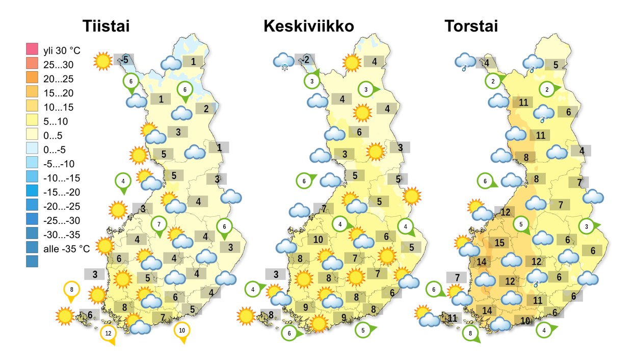 Yöpakkaset vähenevät ja vappupäivänä päivälämpötila voi kivuta etelässä lähelle 20 astetta.Viikonloppuna Suomen yli kulkeneen matalapaineen jälkipuolella Suomessa on vallinnut kolea ja puuskainen pohjoisenpuoleinen ilmavirtaus. Vielä tiistai kuluu samanlaisissa merkeissä, mutta keskiviikkona kylmä pohjoisvirtaus alkaa heiketä ja vappuna lämpimämpää ilmaa alkaa virrata lännestä.