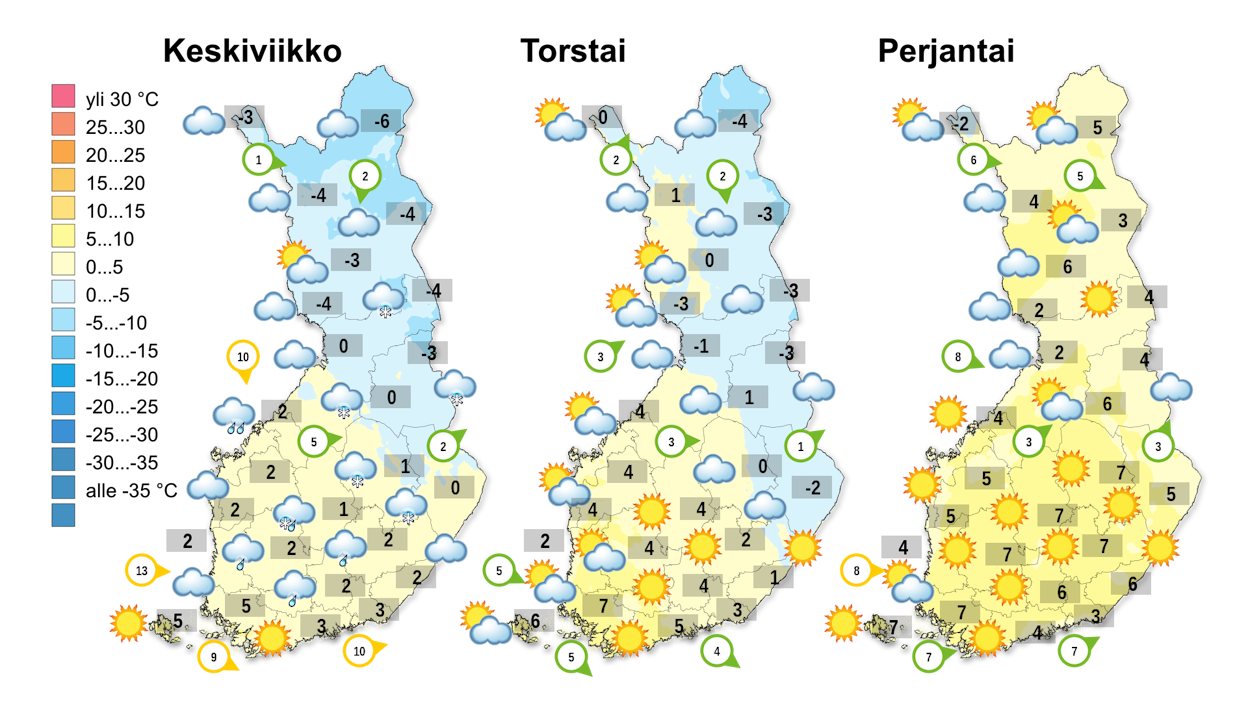 Torstai- ja perjantaipäivät ovat suuressa osassa maata aurinkoisia ja vuodenaikaan nähden lämpimiä.Keskiviikkoaamuna edellisen sadealueen takareuna on vielä itärajalla, kun seuraava matalapaineen alue on jo saapumassa Ruotsin puolelta. Uusi matalapaine tuo mukanaan räntä- ja lumisateita Pohjois-Pohjanmaan länsiosaan ja muihinkin Pohjanmaan maakuntiin.