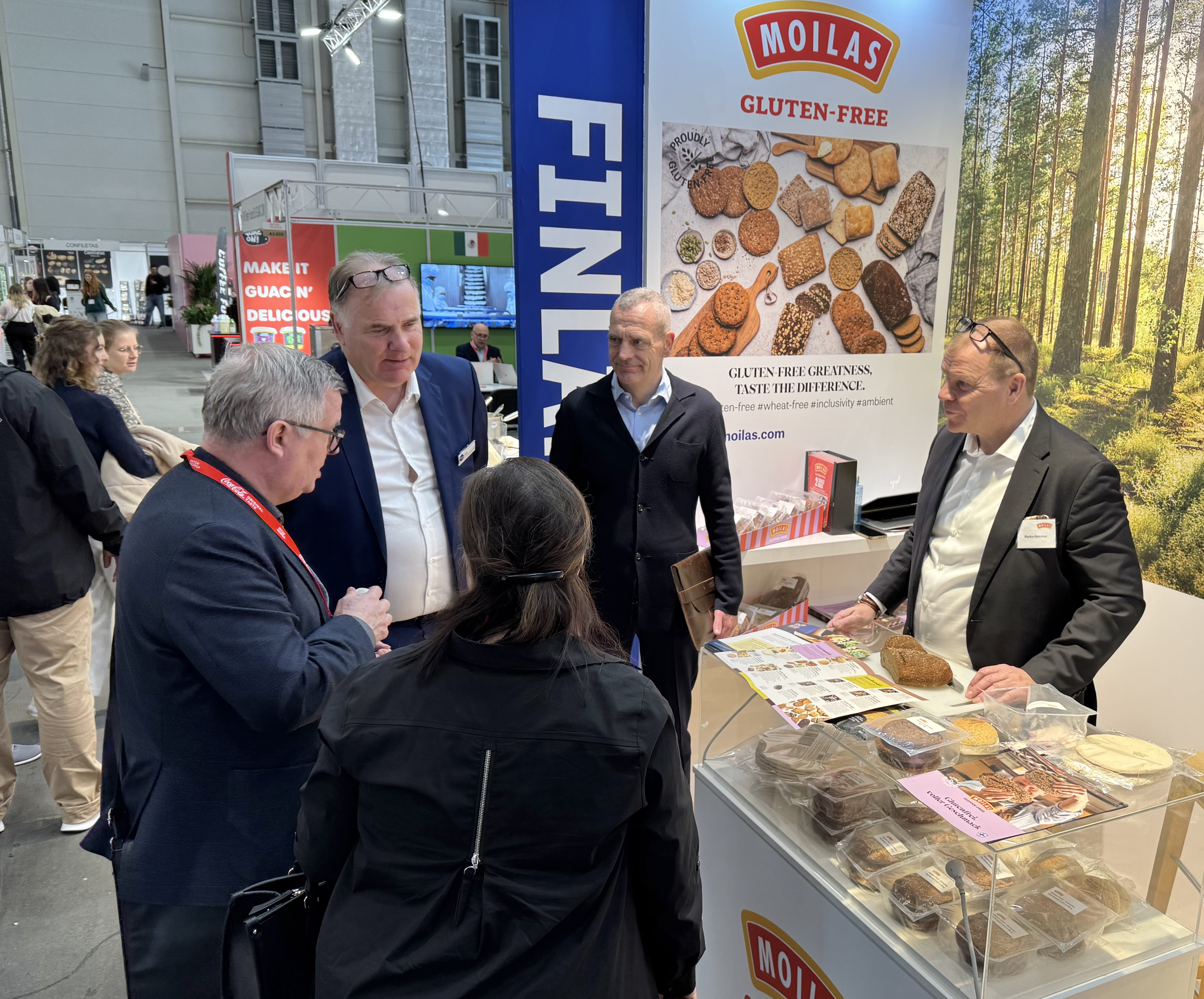 Moilasen myyntijohtaja Marko Hammar (tiskin takana) ja viennin yhteistyökumppani Martin Göldenitz (toinen vas.) esittelevät gluteenittomia tuotteita Hampurissa. Kuva: Eija Mansikkamäki”Täällä on mennyt erinomaisesti”, ruokavientiyhdistys SUVI ry:n vientijohtaja Horst Neumann hihkuu Saksan Hampurista. Siellä on ollut perjantaista lähtien Euroopan suurin elintarvikealan tapahtuma, Internorga-messut.