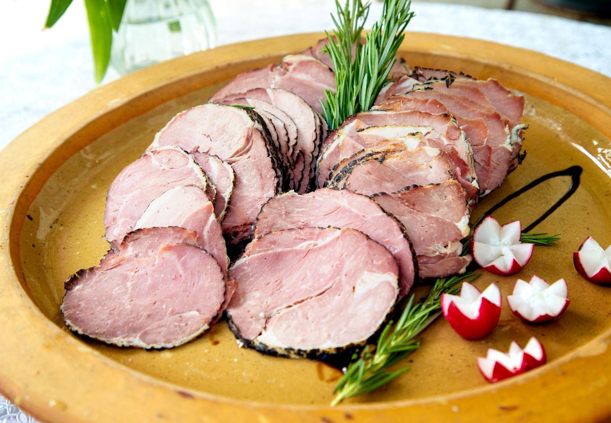 Omassa palvaamossa palvataan muun muassa hanhea, pekonia, alkuperäiskarjaa ja tässä tarjolla olevaa karitsaa. Kuva: Sanne KatainenRavintola, hotelli, kesäterassi, kokoustiloja, kokkikoulu, keikkapaikka, kesäteatteri, viinikellari, savusauna, puoti, palvaamo, pakohuone – ja neljä mehiläispesää.