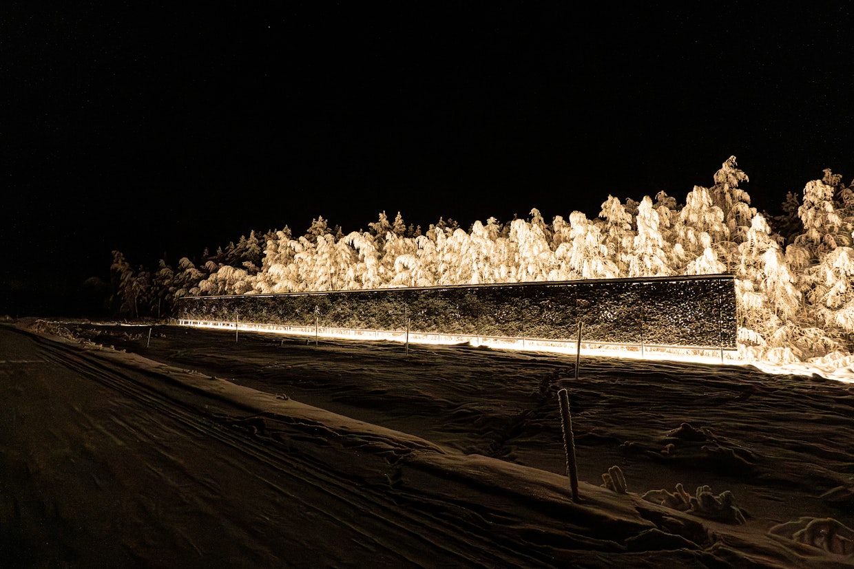 Teos on rakennettu kuumasinkitystä teräksestä, koivuhaloista ja led-valaisimista. Kuva: Thorbjörn LjungeldMutkalammin tuulivoimapuiston noin 30 vuoden elinkaaren aikana teoksen puumateriaali harmaantuu ja sammaloituu, mutta säilyy osana ympäristöä, tiedotteessa kerrotaan.