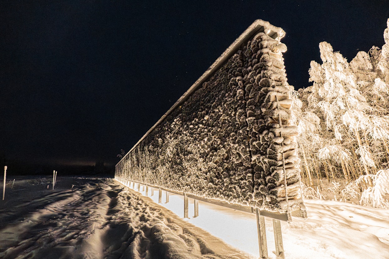 Mutkalammin tuulipuisto tilataideteos 94 m³/h on viimein valmis. Tuulivoimapuiston keskimääräinen energiantuotanto tunnissa vastaa 94:tä mottia koivuhalkoja. Kuva: Thorbjörn LjungeldMT:n toimittaja ja kuvaaja ihmettelivät viime keväänä Kannuksentien varressa Kalajoen Raution kylässä sijaitsevaa valtavaa metallikehikkoa, johon oli pinottu polttopuita. Halkohäkkyrä paljastui keskeneräiseksi taideteokseksi.