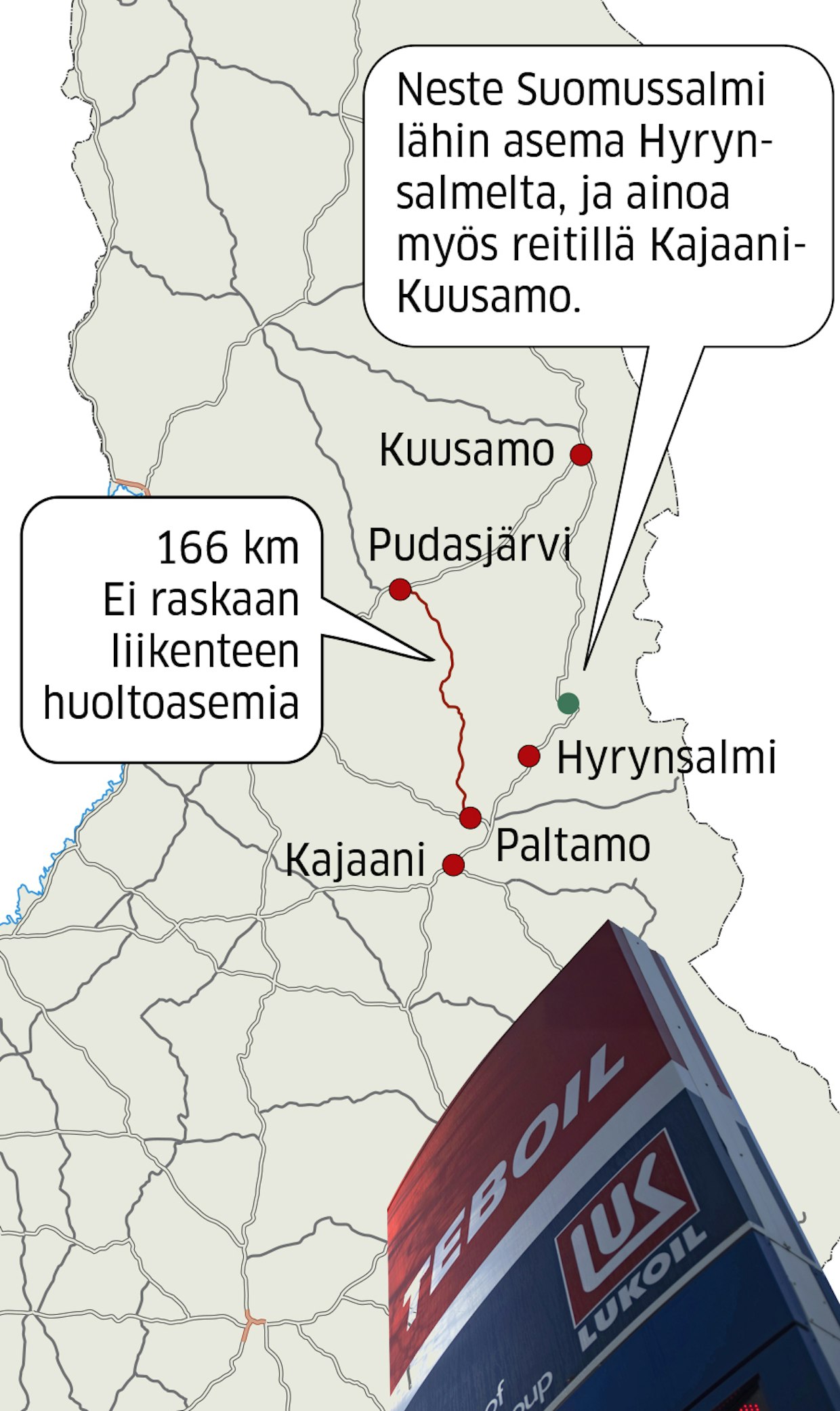Kujalan mukaan kaikkiaan 85 prosentissa maasta löytyy asemat myös raskaalle kalustolle, mutta erityisesti Kainuussa, Pohjois-Karjalassa ja Pohjois-Savossa yrittäjillä on tarvetta poiketa reitiltä.