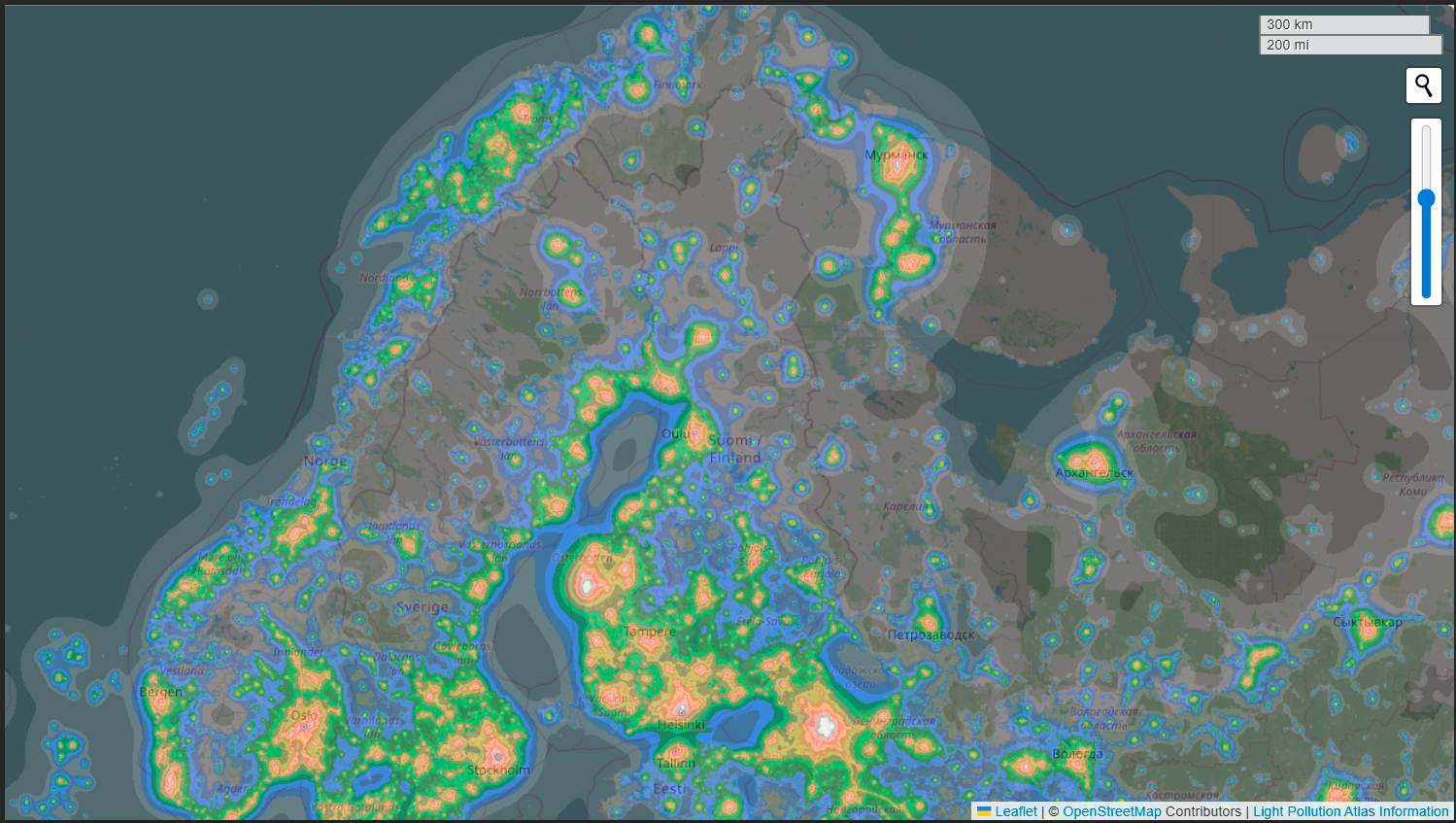 Ihmisen tuottama valo näkyy hyvin avaruuteen. Kuvassa satelliittikuvien perusteella laadittu Light Pollution Atlaksen kuva valosaasteesta Suomen yläpuolelta.”Havaintojeni mukaan paras paikka löytyy Lemmenjoen kansallispuiston pohjoispuolelta, huonoimmat taas Närpiön seudulta, missä kasvihuoneiden valaistus vaikuttaa laajalle”.