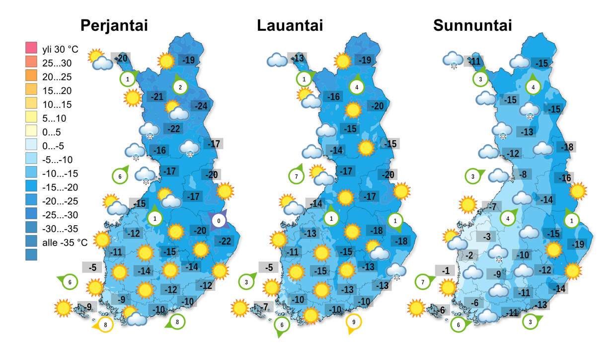 Pakkanen alkaa kiristyä jo perjantaiyöksi, etelässä ollaan -10 ja -20 asteen, maan keskiosassa -15 ja -30 asteen, pohjoisessa -20 ja -35 asteen välillä. Perjantaina päivällä lämpötilat ovat -12 ja -20, maan pohjoisosassa -18 ja -30 asteen välillä.