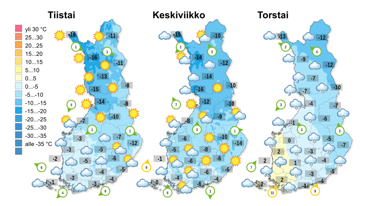Ennen lauhemman säätyypin tuloa yöt ovat edelleen kylmiä ja parinkymmenen asteen pakkalukemia mitataan vielä keskiviikon vastaisena yönä laajalti maan keskiosia myöten. Etelä-Suomessakin kireämmät kuin -15 asteen lukemat ovat mahdollisia.
