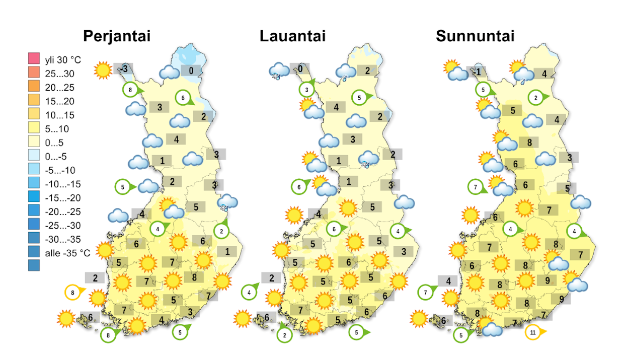 Pohjois-Suomen iltapäivä onkin enimmäkseen poutainen, joskin runsaspilvinen. Lämpötila vaihtelee Pohjois-Lapin muutamasta pakkasasteesta noin +5 asteeseen. Maan etelä- ja keskiosassa perjantaipäivä on aurinkoinen ja lämpöasteita on 1 ja 8 välillä.